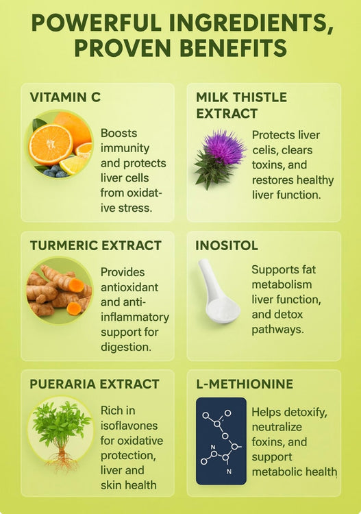Explore real results of our potent liver support blend in action. See how Milk Thistle, turmeric, and Pueraria root team up to fortify your natural detox pathways and leave you feeling refreshed and renewed.